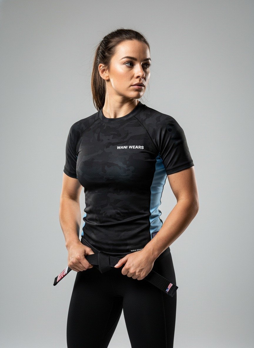 Image Alt-Text: Set the image alt-tag to “Female athlete wearing a camo BJJ rash guard.”