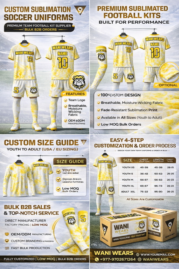 Dominate the field with WANI WEAR’s premium custom sublimation soccer uniforms, designed for professional teams, clubs, and sportswear brands looking for high-quality, bulk football kits supplier.