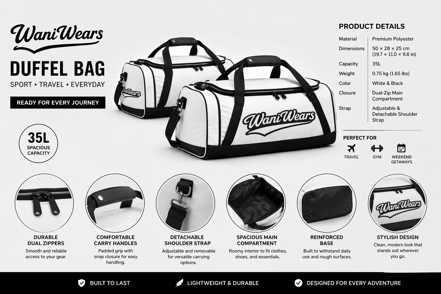 Upgrade your team gear with the Wani Wears Premium Custom Sports Duffel Bag, designed for athletes, sports clubs, schools, gyms, and B2B buyers worldwide. Built with high-quality durable polyester fabric, reinforced stitching, and spacious storage compartments, this bag is perfect for carrying uniforms, shoes, training gear, and travel essentials.